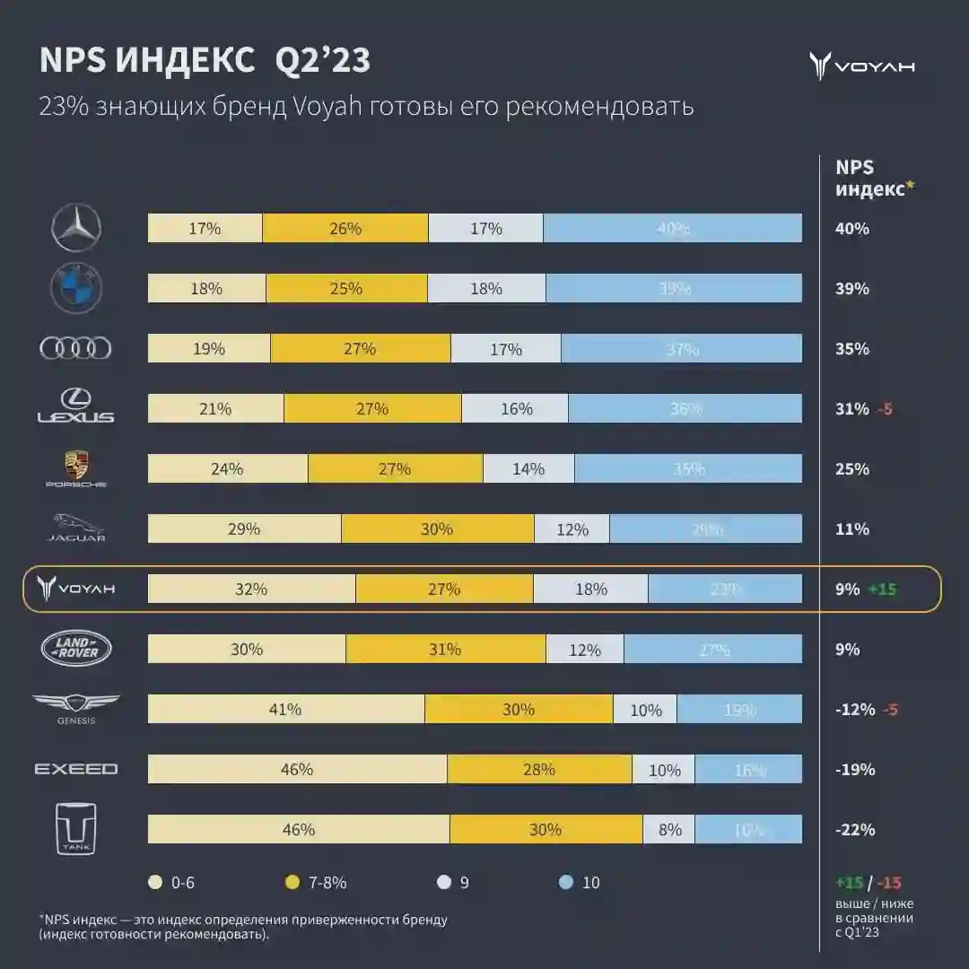 В первом полугодии 2023 года2 люксовый бренд VOYAH стал лидером по росту индекса индекс потребительской лояльности — увеличение готовности рекомендовать к покупке продукцию люксового бренда VOYAH составило 15 процентных пунктов при уровне значимости 95%. В то время как другие игроки анализируемого сегмента продемонстрировали стагнацию или падение. По итогам второго квартала 2023 года индекс потребительской лояльности составил 9%, что позволило бренду, меньше чем за год присутствия на российском рынке, превзойти показатели ряда грандов мирового автопрома, включая известные премиальные марки с вековой историей. Более того, результаты некоторых из них даже не смогли достичь положительного значения. Эксперты рассчитывали индекс индекс потребительской лояльности среди потребителей, знающих марку, как разницу между теми, кто готов или не готов рекомендовать ее модели к покупке. Таким образом, в настоящий момент показатель позитивного отношения к VOYAH находится на уровне выше среднего.